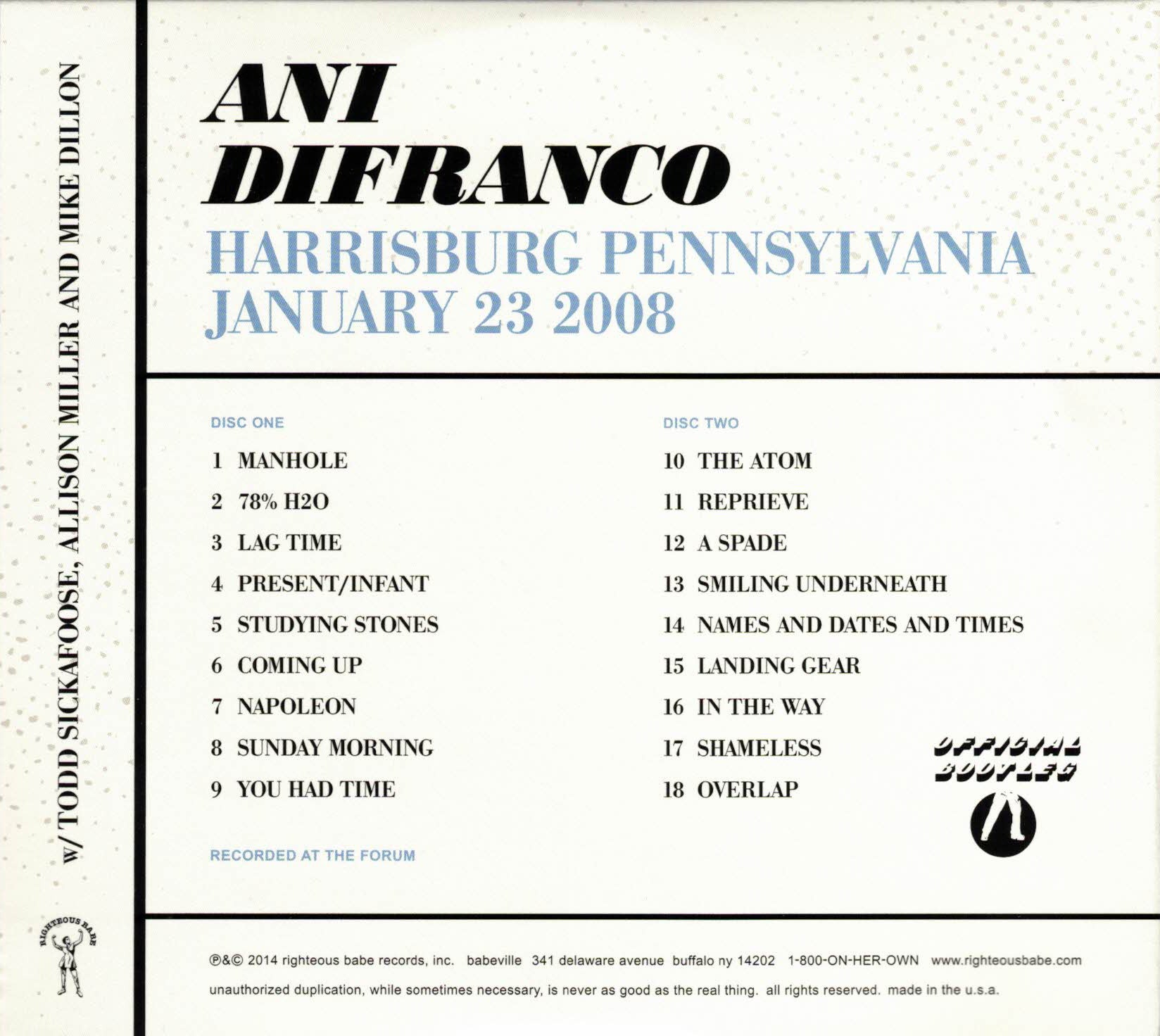 Back in the winter of 2008 Ani DiFranco took the stage at the Forum in Harrisburg, Pennsylvania with Todd Sickafoose on bass, Allison Miller on drums, and Mike Dillon on vibes / percussion. Despite having strawberries in her teeth and a broken nail, Ani had a folking good time and added it to the list of Official Bootleg recordings. Featuring the first time for “A Spade” and the poem “Reprieve” in the live series, plus beautiful renditions of “Studying Stones,” “You Had Time,” and “Overlap”. Throw in a few anecdotes about Petah (just a baby at the time), vocal chords, ‘Happy Birthday’ shout outs, organized religion (can I get an “Amen”) and you have two discs of pure acoustic joy.