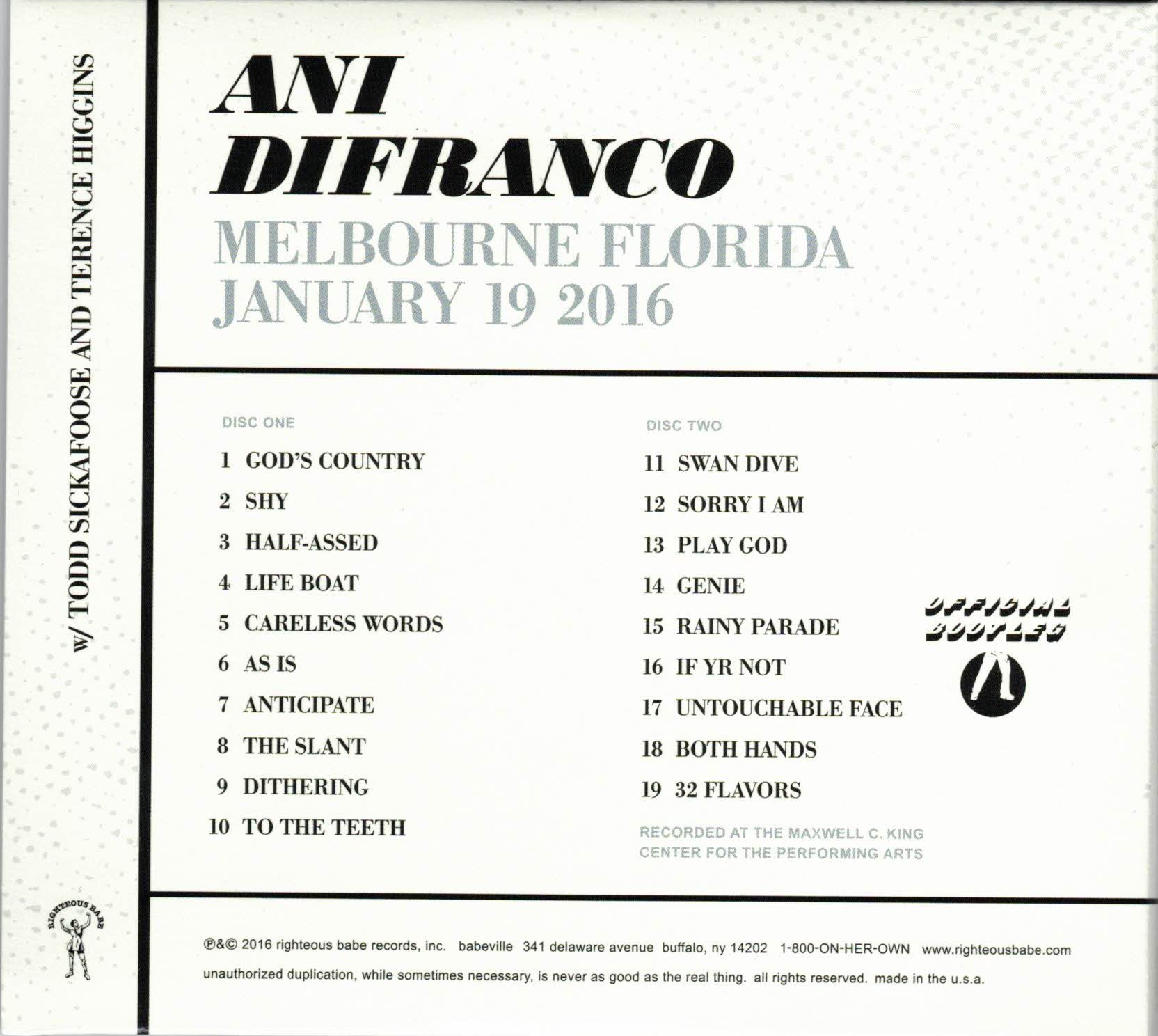 The newest bootleg comes from Melbourne…..Florida! Catch two discs of Ani playing new renditions of classic tunes like “32 Flavors,” “Shy,” and “Untouchable Face” along with more recent songs including “Play God” from her forth coming album due out in 2017. Also, these are the first official Bootleg appearances of “The Slant,” “Dithering,” “Sorry I Am,” “Rainy Parade,” and “If Yr Not.” Her legs might have been wobbly from a 10 mile bike ride the day before but her performance is strong. Riding with her on this one is Todd Sickafoose on bass and Terence Higgins on drums.